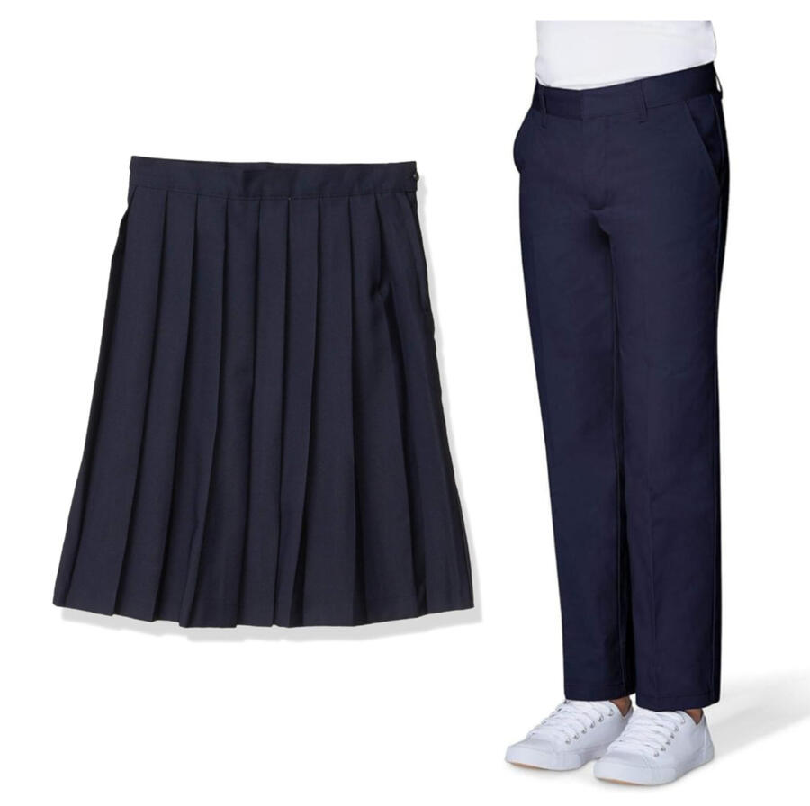 Navy blue chinos (no rips, stains, tears or decorations). Girls must also have a navy blue pleated (fully pleated on back and front) KNEE LENGTH SKIRT or scooter skirt (skort) without buckles or tabs. All skirts must be worn with shorts or spandex underneath.